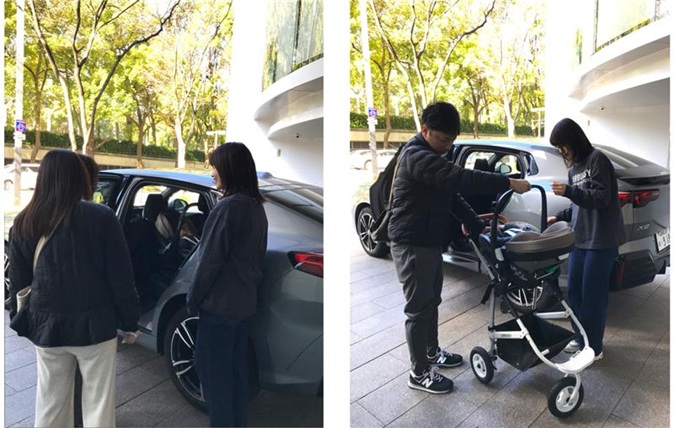 「スライド機能のおかげで、屈まずに乗せ降ろしができるので腰への負担も少なく、楽に子供を乗せ降ろしできるのが便利だね!」と気にいっていただけたご様子でした。